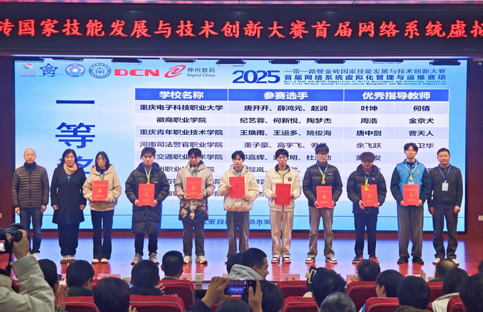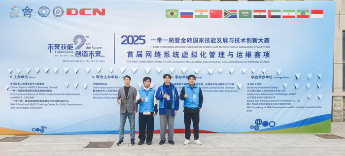 学院在2025“一带一路”暨金砖国家技能发展与技术创新大赛“网络系统虚拟化管理与运维”赛项中斩获一等奖发表时间:2025-12-25 09:08 12月19日-20日,2025“一带一路”暨金砖国家技能发展与技术创新大赛首届“网络系统虚拟化管理与运维”赛项全国总决赛在安徽合肥成功举办。信息学院计算机网络技术专业邓嘉辉、麦家明、杜泓劭三位同学凭借扎实的专业知识、技术功底和出色的临场发挥,斩获全国总决赛高职组一等奖。